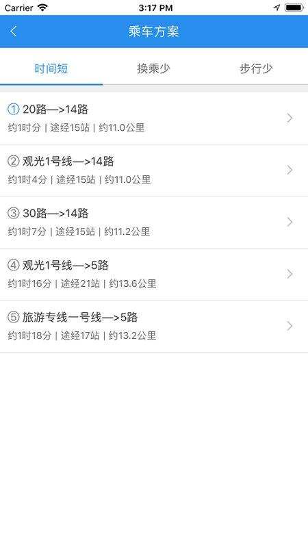 4、多种换乘方案:提供时间短、换乘少、步行少、路程短四种优先级排序的多种换乘方案,并提供换乘线路的车辆到站信息,让市民随时掌握换乘线路车辆位置。